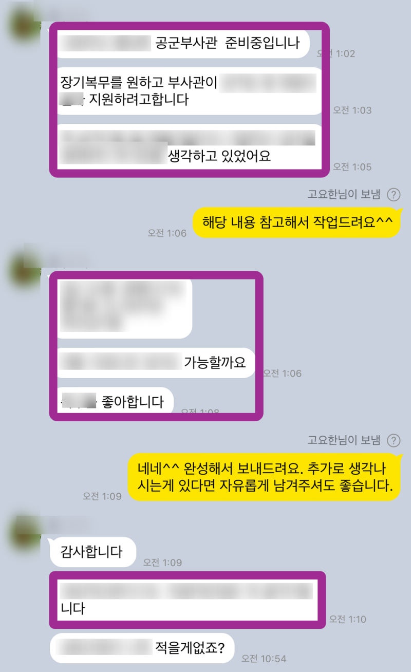 지원자 A씨와 함께 문장 하나하나를 다듬었습니다. 추상적인 표현은 구체적인 행동이나 결과로 바꾸고, ‘좋은 경험이었다’는 식의 표현 대신 ‘이 경험을 통해 한 역량을 키울 수 있었고, 이는 공군 항공정비 부사관으로서 한 부분에 기여할 수 있을 것입니다.’ 와 같이 직무 연관성을 명확히 했습니다. 솔직히 말씀드리면, 이 부분에서 거의 대필 수준으로 갈아엎었다고 해도 과언이 아닙니다. A씨가 처음 들고 오신 자소서와 비교하면 글의 구조와 내용이 완전히 달라졌죠.