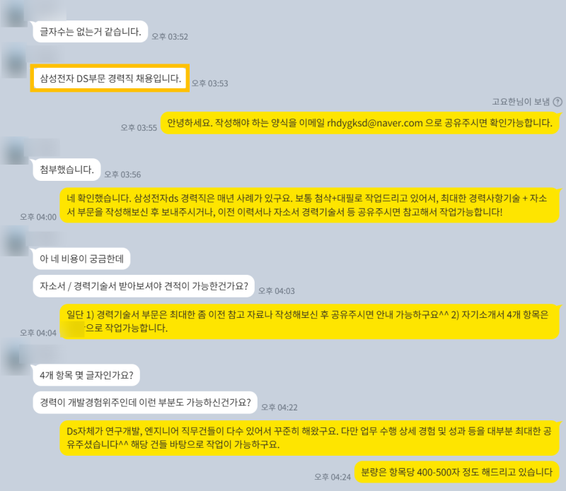 지금까지 수백 건의 대기업, 공기업, 중견기업, 공무직 등 다수의 합격을 바탕으로 진행 드리고 있습니다. 단순히 글만 고쳐드리는 것이 아니라, 채용공고, 자소서 항목 및 문항분석, 그리고 자기소개서 작성하는 방법까지 아낌없이 공유해드리며 여러분이 자신감을 가지고 다음 단계로 나아갈 수 있도록 돕고 있습니다. 여러분의 소중한 시간을 절약하고, 합격이라는 달콤한 결실을 맺을 수 있도록 저의 모든 노하우를 아낌없이 풀어드리겠습니다! 🎁 언제든 편하게 문의 주세요! 😊