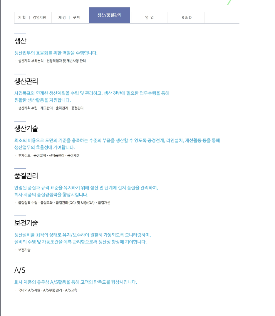 • 품질 관리 및 검사: 생산 제품의 품질 기준 준수 및 검사, 문제 발생 시 원인 분석 및 재발 방지 대책 수립