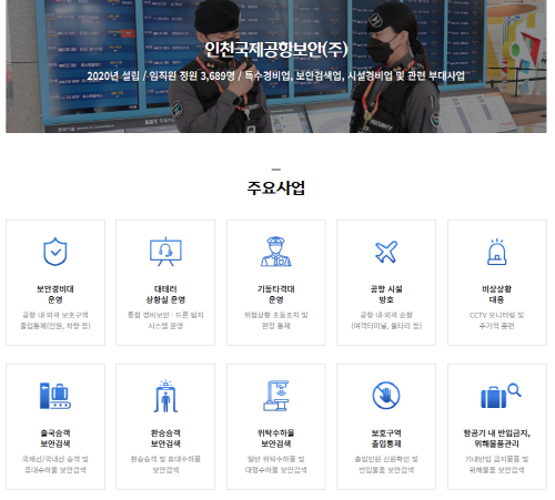 - 주요 사업: 공항 보안, 시설 경비, 보안 검색, 출입 통제, 보안 교육