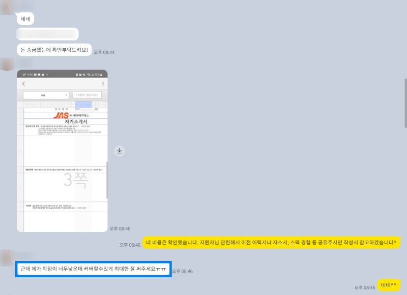 더 이상 혼자서 자기소개서 때문에 고민하지 마세요! 저는 여러분의 합격을 위한 가장 확실하고 전문적인 솔루션을 제공합니다. 1:1 맞춤 컨설팅, 꼼꼼한 첨삭, 그리고 합격 노하우 전수를 통해 여러분의 꿈을 현실로 만들어 드리겠습니다. 지금 바로 문의하세요!