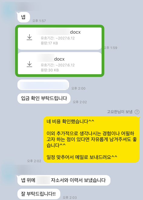 >> Step 2: 이력서 및 자소서 초안 전달 (보유하고 계신 자료를 최대한 자세하게 보내주세요!)
