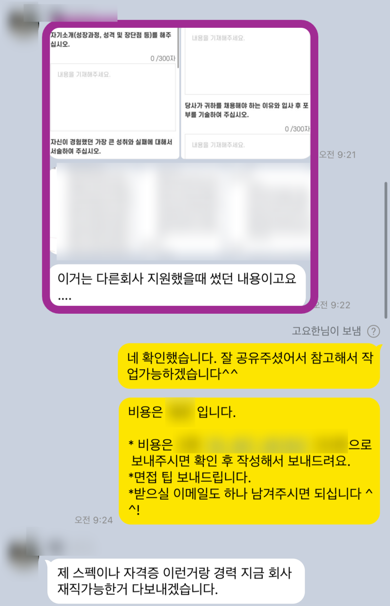 각 단계별로 지원자분과 끊임없이 소통하며, 최적의 자소서를 만들기 위해 노력했습니다.