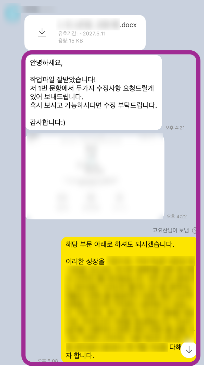 • >> [4단계] 1차 초안 전달 및 피드백: 초안 작성 후 지원자분과 소통하며 디테일 조율